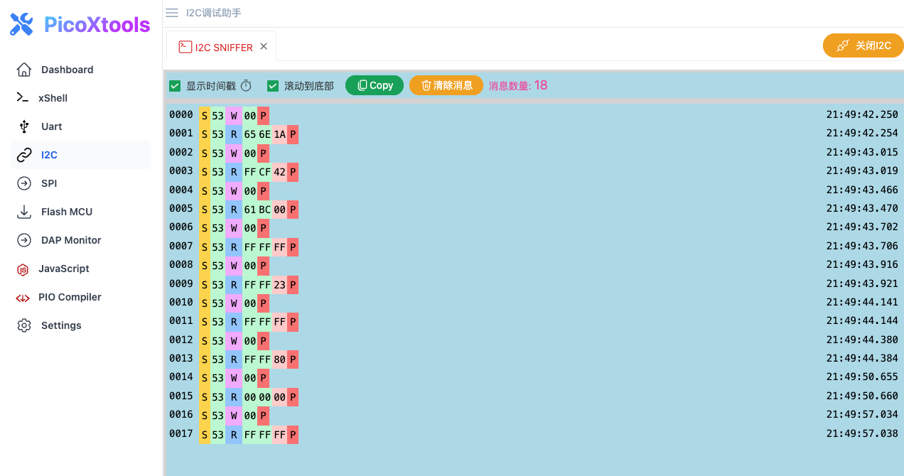 PicoXtools 工具的 I2C 调试助手具备Sniffer(抓包)模式,核心能力与呈现形式如下: