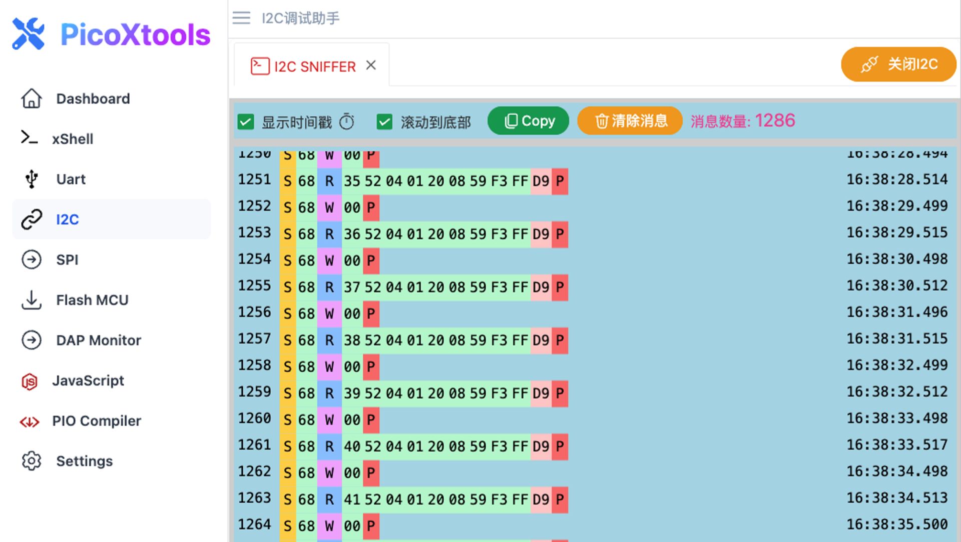 显示时间戳:开启后每条通信数据会附带时间信息(如右侧的16:31:34.570)。滚动到底部:自动跟随最新数据滚动界面。Copy:复制捕获的 I2C 数据。清除消息:清空当前数据列表。消息数量: 800:当前已捕获 800 条 I2C 通信记录。关闭I2C:停止嗅探功能。