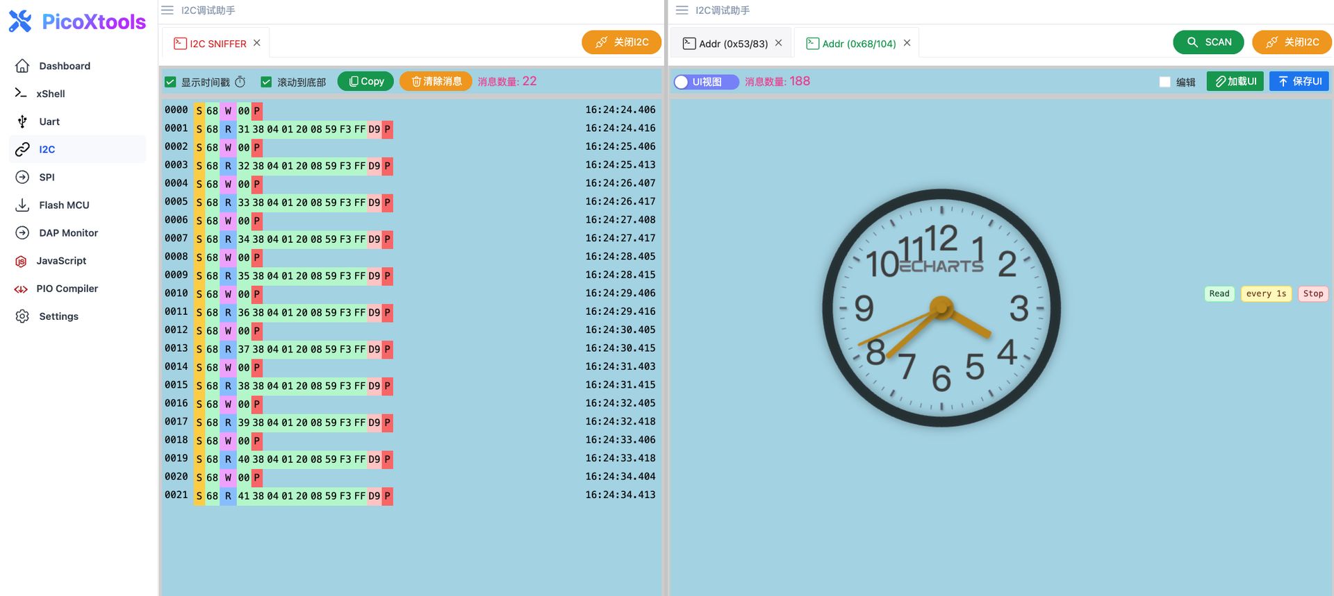 上图借助两个 PicoXTools 一个作为I2C总线 Sniffer实时监控总线上的读写交互;另一个与RTC(DS3231) 模块通信