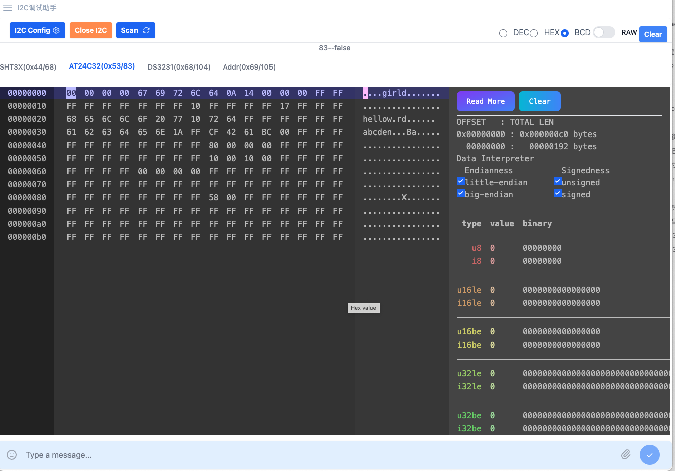 消息视图底部输入框可以直接输入指令控制 I2C设备,指令分为读指令与写指令;多条命令以';'隔开。语法如下:
